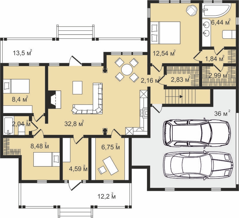 кухня-столовая, три спальни с гардеробными, кабинет и гараж на две