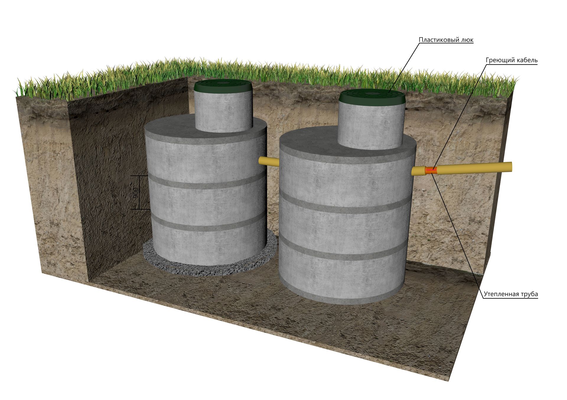 2. Автономная система канализации "выгребная яма". Бетонные кольца, пластиковый люк, утепленная труба, греющий кабель.