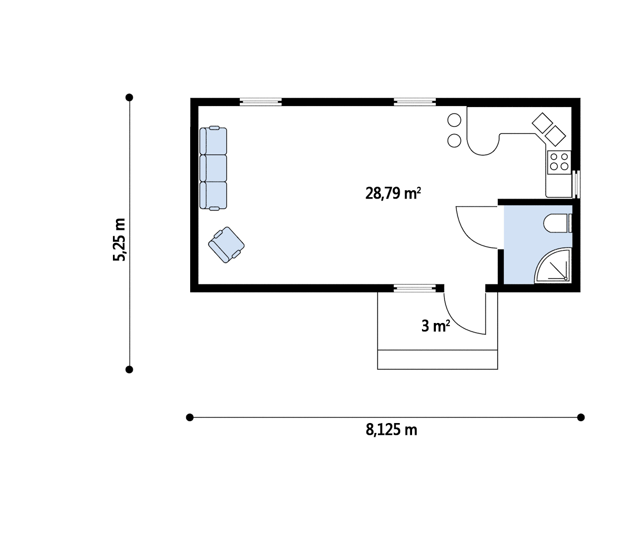 Дом студия 31,79 м2, уникальный вариант загородного компактного дома с планировкой студии как для круглогодичного проживания, так и для выходного дня.